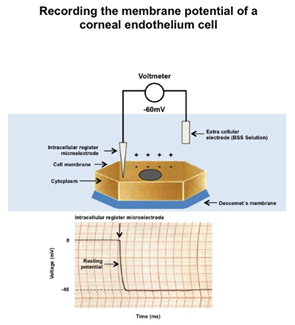 The endothelium is a single layer of cells extending over the inner surface of Descemet’s membrane. Its sub cellular organization reflects that the endothelium is extremely active metabolically. It functions as a regulator of corneal water content. Endothelium cells are mitochondria-rich and represent an active metabolic pump that carries out this function in conjunction with the tear film. The cornea must remain relatively dehydrated to retain its transparency. If the water content of the ground substance increases significantly, the stroma will be- come swollen and opaque, and the two most important optical functions, transparency and refractive power, will be severely compromised. The cornea is transparent, but the mechanism whereby corneal transparency is maintained is not known. The factors believed to contribute to its clarity may be divided into two categories:1 the physical arrangement of the fibers and cells, and2 their state of hydration. Although many studies have been performed about corneal transparency, there are some gaps to be full field. We performed 50 experiments on corneal preparations of Sprague-Dawley rats and analyzed the presence or absence of electrical sign by recording its voltage variations through one two pore electrode connected to a Grass polygraph. This study aims to register and quantify the resting potential of endothelial cells, as well as bring an important contribution to the knowledge of the normal physiology of the corneal endothelial cells.