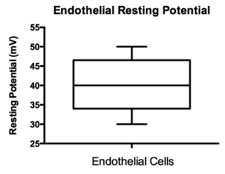 Our data demonstrated that the mean of endothelial resting potentials was 42.75 mV±3.05 (Figure 2). All animal cells maintain a voltage difference across their cell membranes, as well as some organelle membranes, such as the mitochondrial membrane. This voltage difference represents a source of potential energy that cells can store to move molecules across membranes. The voltage difference is termed the resting membrane potential difference, or the membrane potential, for short.