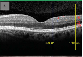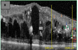 Figure 2 Hard exudates, note their distribution in the outer retinal layers, High reflectivity and the presence of back shadowing.23