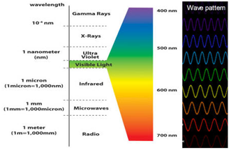 A green iris (the colorful layer covering the eye pupilla) reflects back light in “green light frequency colour’’ so that it is seen green. A brown iris however must reflect absorbed light back to meet “brown light frequency’’ level criteria so that it is seen brown. But, as they are reflecting light in different frequencies, it means that the conical cells around iris (responsible from absorbing light and passing it to the vision center of the brain where vision appears) must be passing the absorbed light there in the same frequency as the frequency of light absorbed.2 But it is known that green and brown eye colours, in order to be seen “green’’ and “brown’’ must be reflecting light in the associated “green’’ and “brown’’ light frequencies respectively.3 But since their reflected colour frequencies are different (green and brown), it means “colour’’ interpretation or perception of brain of the owner of that eye colour as vision itself is in different colour frequencies, which means and concludes very strong proof that although it is hard to believe or accept, green eyed person sees colours differently than that of a brown eyed person, and different visions are same way valid for all different eye colours.4 Below there is a figure showing what frequency yields to what colour appearance. (Figure 1)5