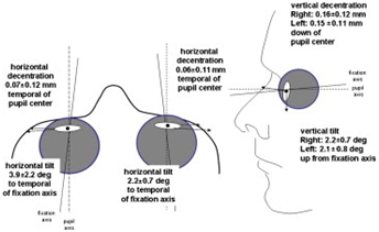 In depth evaluations of lens tilt and decentration are carried out using mainly two devices: A Purkinje-meter1 or a Scheimpflug imaging based system, where the latter is commercial available for advanced ophthalmologic diagnostics. Both methods deliver comparable results, as shown in a cross-validation study.2 Using these methods, it has been found that even in normal eyes with good visual acuity, a small amount of lens misalignment relative to the optic axis exists (Figure 1)3 therefore; a small amount of lens misalignment seems to be physiological. Tilt and decentration plays an important role especially when artificial lenses (IOL) are implanted. Therefore, IOL position was studied since the early years of cataract surgery.4 Severe dislocation of the implanted IOL optic was found to decrease the retinal image quality while losing 11% of effective optical zone when a 6 mm optic is decentered by 0.5 mm4 and optic tilting of more than 5 degrees lowers optical quality.5 Despite the introduction of the continuous curvilinear capsulorhexis (CCC) later on in cataract surgery development lowering tilt and decentration of IOL implants, investigators unexpectedly found the resulting optical quality in pseudophakic patients to be worse than in normal subjects.6 It has been concluded that an ideal substitute for the natural lens has to compensate for higher order aberrations (HOA) of the cornea to yield physiological results.