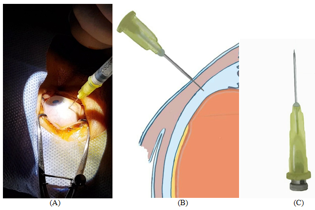 Figure 1 (A) Injection technique B) schematic shows how the needle is only penetrating the suprachoroidal space (C) showing the needle itself with stopper installed.