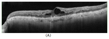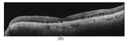 Figure 2 OCT scan showing (A) Cystoid macular edema with increased hyper reflectivity in the inner retinal tissue due to retinal vein occlusion with RPE alternation related to drusen formation (B) 48hrs later after suprachoroidal injection of triamcinolone acetonide showing decreased in central retinal thickness and resolution of cystic spaces (C, D) 4weeks and 8weeks OCT scans showing sustained effect of treatment with suprachoroidal triamcinolone acetonide.