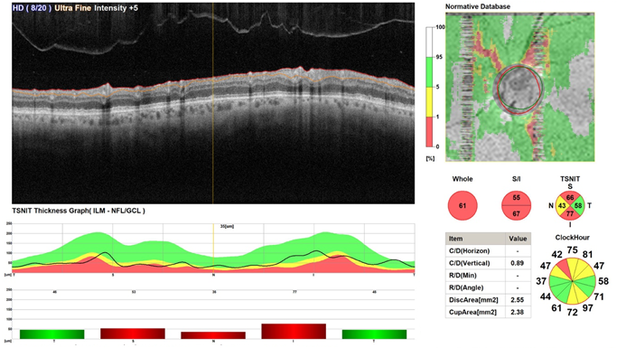 OCT of the optic disc map and circle shows no significant changes in term of ganglion cell volume and thickness of the RNFL (Figure 3).