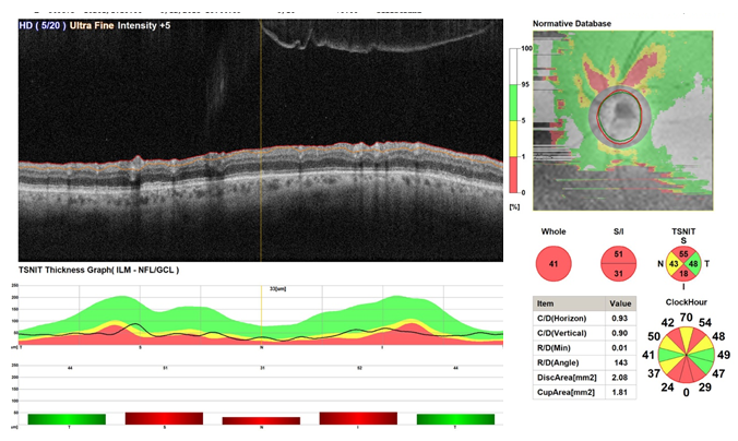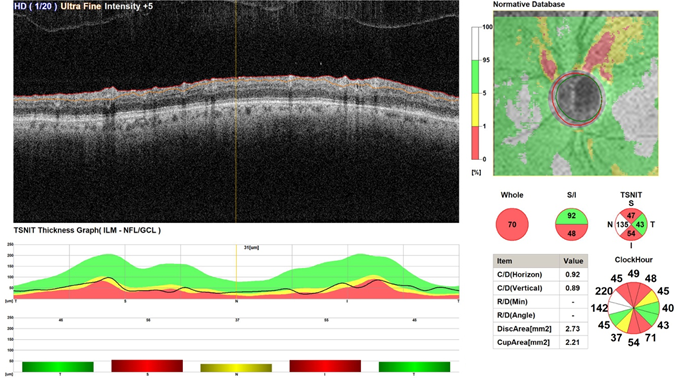 The OCT of the optic disc in map and circle scans shows reduction of ganglion cell complex volume along with reduction of RNFL thickness in superior, inferior, and nasal to the optic disc.