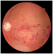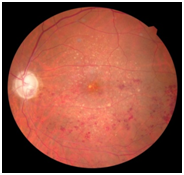 Fundus exam shows reduction of scattered clusters of dot and blot hemorrhages without macular edema, with 8weeks there was no evidence of intraocular inflammation or toxicity nor systemic complication (Figure 4).