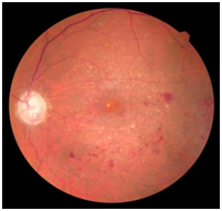 A 76years old male presented to Marashi Eye Clinic with complains of onset reduction of vision in his left pseudophakic eye 4 days ago, his best correct visual acuity 20/80 at presentation with a referaction -1.00/-0.50 x 18 where his right eye has no light perception due to uncontrolled glaucoma, although patient did not report any family history but he reported an ischemic stroke 45days ago and myocardial infarction 2years ago. His anterior chamber examination was unremarkable with no signs of rubeosis iridis with well centered intra ocular lens, on gonioscopy the angle was open with no signs of neovascularization, blood in schlemm's canal or fibrosis, intraocular pressure was 19. The funds examination showed scattered clusters of dot and blot hemorrhages limited to the inferior half of the posterior pole with significant cystoid macular edema and some hard drusen, and the diagnosis was made of branch retinal vein occlusion with cystoid macular edema; the optic disc shows cup to disc ratio up to 0.8.