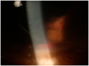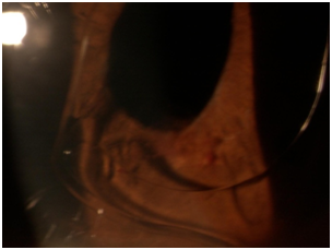 Figure 2 10x Slit lamp photo of malpositioned ACIOL with haptic rubbing on iris tissue causing hyphema.