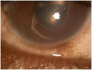 Patient presented in urgent care reporting that the condition is not any better with complaints of pain, redness, photophobia, tearing, discharge, discomfort, and shortness of breath. Patient reported good compliance on taking prednisolone, Combigan®, Azopt®, but has not obtained atropine from the pharmacy yet. Patients VA was light perception OD and similar entrance testing results as the last follow up. Slit lamp examination revealed microcystic corneal edema, diffuse 3+ PEE, the same anterior chamber findings, except newly noted that the lens OD was a poorly fitting ACIOL touching the cornea and the iris. Intraocular pressures were 47 mmHg, 14 mmHg OD, OS. After dilation, the 2+ vitreous hemorrhage was noted again and all other findings appeared normal (Figures 1−3). Additional diagnostic testing was ordered for exterior/slit lamp photos, which were interpreted as a poorly fitting ACIOL OD with hyphema and NVI. The retinal surgeon performed an intravitreal injection of Avastin® 1.25 mg to regress neovascularization of the iris and to stabilize/improve the eye. Post-injection IOP via tactile measurements were now estimated to be 21 mmHg, 21 mmHg OD, OS. After the injection, the assessment of proliferative diabetic retinopathy with UGH syndrome OD was made. The plan stated to proceed with glaucoma/cataract specialist with ACIOL removal and IOP management.