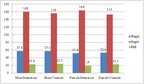 The mean age, weight, height and BMI of male swimmers were 15±1.9, 57.4±9.9 kg, 160±17.5 cm and 22.8 ± 5.3 kg/m2 respectively. The age and sex matched controls too had a mean age of 15 ± 1.9 years with mean weight 57.3±8.8 kg and mean height 156±12.8 cm and BMI the mean value 23.7 ± 2.5 kg/m2 (Table 1).