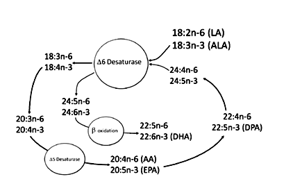 For the omega-6 series conversion of LA to the 20-carbon arachidonic acid (AA, 20:4 n-6) occurs and for the omega-3 series, ALA converts to 20-carbon fatty acid EPA (20:5 n-3) and a 22-carbon fatty acid DHA (22:6 n-3). It is remembered that only one set of enzyme works here and both fatty acids compete to use that enzyme. And delta 6 desaturases (D6D) is regarded as the main regulator enzyme as it works twice in the conversion of ALA to DHA.3 But this conversion occurs in very little amount for the infants. That is why it is recommended to feed them LC-PUFA directly so that there will be no deficiency in their body.