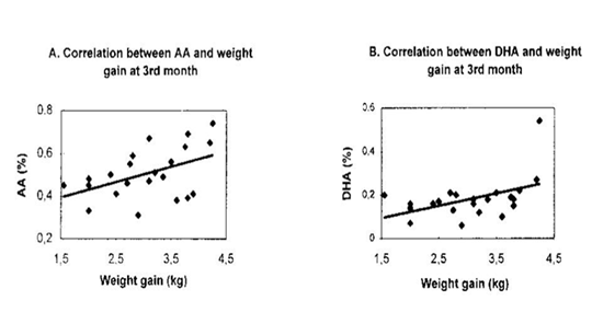 Figure 3 Correlation between levels of AA and DHA in breast milk and weight gain of 3 months of age in Chinese infants.8