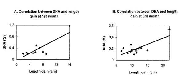 Effect on infant growth: Report showed that the birth weight of the infant is related to mother’s consumption of fish. Here fish is one of the main sources of DHA. It also has been reported that infant growth and blood levels of AA are correlated. In Figure 3 the correlation between levels of AA and DHA in the breast milk and weight gain of 3 months infant in China has been showed. Not only weight but also the length of the infants is correlated with the DHA of their mothers’ milk (Figure 4).8