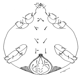 Ventral gnathosomal sub-capitulum with only one pair of seta m and seta n is absent, two pairs of sub terminal adoral setae or1 & or2, seta elcp on subcapitulum not visible, Ventral idiosoma provided with 4 setae (1A-4A) without conspicuous platelets. 2 pairs of paragenital setae and 3 pairs of smooth anogenital setae (Figure 2).