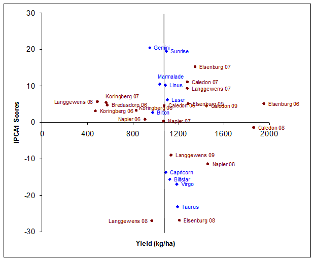 Cultivar Bilton gave the highest yield of 2368 kg ha-1 at Elsenburg during the 2006 season. Bilton also gave the second highest yield at Caledon (2008) and Koringberg 2009, and the third best yield at Koringberg 2006. Cultivars Bilton and Laser were the AMMI best choices for most of the environments. Although Bilton had a slightly lower yield (970 kgha-1) it had higher stability (ASV=19.9). Laser gave higher yields (1100kg ) but lower stability (ASV=25.7). Other high yield performers was the cultivar Sunrise that gave the highest yields in 5 out of the 20 environments namely Bredasdorp (2006), Napier (2008), Koringberg (2006+2007), and Langewens 2008. Cultivar Bilstar gave the highest yield in 4 out of the 20 environments, namely: Caledon (2008), Napier (2007+2009) and Koringberg (2009). Although Taurus was found to be the most unstable cultivar according to the ASV values, and showed limited adaptation to testing environments, it gave a grain yield that is above average (Table 4), whereas the most stable cultivar (Bilton) gave below average yields. For this reason, stability in itself cannot be used as the only parameter for selection, as the most stable cultivar wouldn’t necessarily give the best yield performance. This contradiction was also found by cotton researchers in California17 that found a positive correlation between yield and stability and an association that suggests that cotton cultivars producing higher yields are, in general, lower in stability.