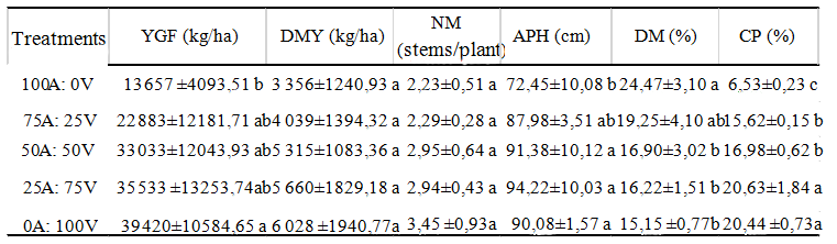Table 1 shows that there are significant statistical differences between treatments (proportions) within YGF and APH (P<0.05), %DM (P<0.01) and %CP (P<0.001), but not within DMY and NM. It is also shown that the overall mean of the proportions was 28905.33 (kg/ha), 4879.44 (kg/ha), 2.7 (stems/plant), 87.22 (cm), 18.40 (%) and 16.04 (%), for YGF, DMY, NM, APH, DM and CP respectively.