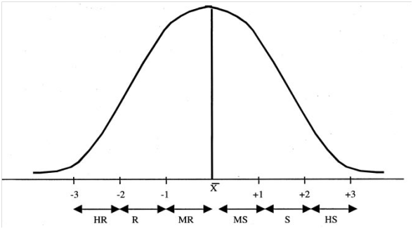The AUDPC estimates were arranged in descending order and then assigned a rank score. Deviation of rank score was computed as the deviation of each rank score from the grand mean of the rank scores. Standardized Deviation (SD) was the product of deviation and a constant (0.2). Genotypes were categorized into various groups based on the SD values.18 Standardized deviation values falling to the right (positive) of the grand mean on the mean distribution curve were considered to be moderately susceptible, susceptible or highly susceptible while those falling to the left (negative) of the grand mean were placed in the moderately resistant, resistant or highly resistant category as shown below (Figure 1). A genotype was considered highly resistant to maize streak disease if its SD value was less than -2 from the grand mean, resistant if it was between -2 and -1, moderately resistant if was within -1 and 0, moderately susceptible if it was found between 0 and 1, susceptible if it fell between 1 and 2, and highly susceptible when it was > 2.8