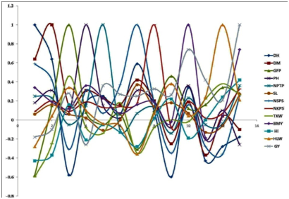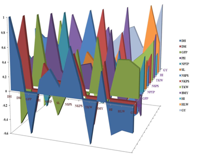 where riy is correlation of ith character with grain yield; r1iPi is indirect effects of ith character on grain yield through first character; rni is correlation between nth character and ith character; n is number of independent variables; Pi is direct effect of ith character on grain yield; Pn is direct effects of nth character on grain yield.