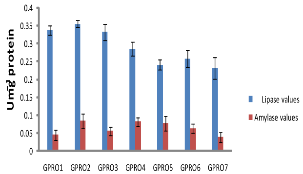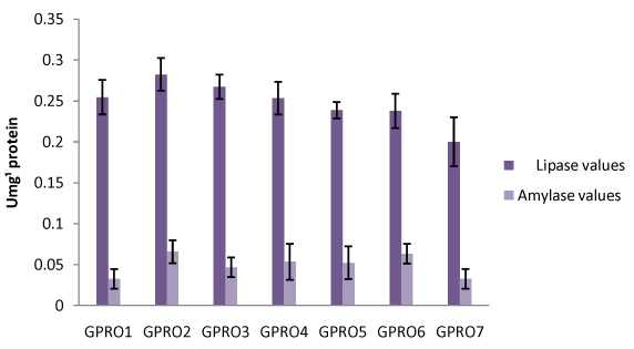 Digestive enzyme assay of Clarias gariepinus fed with probiotics after 30, 50 and 70days of feeding experiment. The lipase levels were greater in fish fed diet supplemented with probiotics compared to control which was without probiotics. Single dose probiotics PRO1, PRO2 and PRO3 had better result than the double dose probiotics diets (diet supplemented with two species of bacteria in equal proportion) with highest value of amylase recorded in PRO2 diet containing Lactobacillus plantarum (Figures 1-3). Fish fed without probiotics showed a significant reduction of amylase (P<0.05) content in gut compared with fish incorporated with probiotics. Mean lipase and amylase values of 0.2824±0.11 and 0.0657±0.02, 0.2912±0.09 and 0.0651±0.01, 0.3421±0.13 and 0.0837±0.012 were recorded in the gut of fish fed with PRO2 (Lactobacillus plantarum) after 30, 50 and 70days of feeding experiment respectively. High amylase and lipase values obtained may be associated with better performance of the probiotic organisms as supported by different authors on some fish species: grouper Epinephelus coioides,11 Epinephelus bruneus12 and Nile tilapia (Oreochromis niloticus).13 After 30, 50 and 70days of feeding trial, the amylase levels of the fish fed with double dose probiotic diet (PRO4, PRO5 and PRO6) were significantly higher (P>0.05) than the control diet but lesser than single dose bacteria (PRO1, PRO2 and PRO3). The results obtained in this study was not in agreements with other work carried out by different authors Salinas et al.,14,15 reported the use of two different bacteria Lactobacillus delbrueckii lactis and Bacillus subtilis as double dose bacteria could be more effective and consistent than a monostrain or single dose probiotic. Improvement in the digestive enzymes activities may be related to the improvement in the microbial flora balance hence, increased digestion and enhanced absorption of food. Incorporation of these probiotics organisms into fish feed resulted in an increase in specific activity of amylase and lipase.