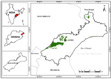 The Phytosociological study of upper storey vegetation layer (tree) was carried out in Balasore district, Odisha. The district lies between 20° 48’ to 21° 59’ north latitude and 86° 16’ to 87° 29’ east longitude (Figure 1). The district is surrounded by Medinipur district of West Bengal in its northern side, Bay of Bengal in its east, Bhadrak district in its south and Mayurbhanj and Keonjhar districts on its western side. The climate of the district is mostly hot and humid. Annual mean temperature and precipitation of Balasore is 32 °C and the average rain fall is 1583mm.14 Relative humidity is generally high throughout the year and varying in the range of 50% to 90%. The district total geographical area is 3806 sq km. Nearly 9.22% of the geographical area of the district is covered by forest which plays an important role in the economy of the district.