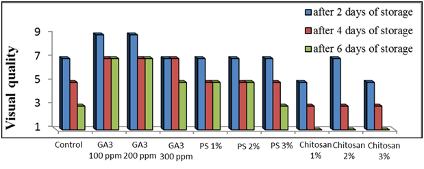 The picture took out from the experiment of fresh-cut globe artichoke storage put in sight that the use of gibberellic acid exhibited comparatively the most obvious results during storage in lessening the deterioration of loss in weight, unmarketable percentage, visual quality, color, T.S.S, total sugars, inulin, ascorbic acid beside lowering the activity of polyphenol oxidase enzyme. However, it was evident that the most effective concentration in this concern was 200 ppm. It should be realized that the obtained results for GA3 may be related to a part role played by GA3 in lowering the respiration rate,30,31 it's striking effect in delaying the senescence,32,33 increasing the content of cuticle and sustain the integrity of membranes30,31,34 which reduce the water loss and increasing the cell-wall thickness that protect the fruits from the fungal infection,35,36 delaying the loss of chlorophyll and consequently retarded the appearance of brown color.37-42
