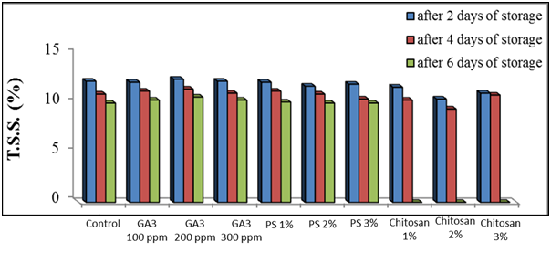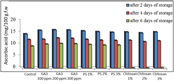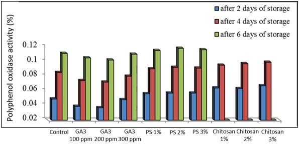 From another point of view, the treatment of chitosan is ranked the second in less loss in weight percentage after gibberellic acid. However, the most effective concentration was 3%. The role of chitosan is to minimizing weight loss percentage through enables epidermal tissues to control water loss, a physical barrier to water vapor, reducing moisture loss and delaying fruit dehydration47-50 forms a layer of semi-transparent to smooth pericarp surface.51 The picture took out from the experiment of fresh-cut globe artichoke storage put in sight that the use of gibberellic acid exhibited comparatively the most obvious results during storage in lessening the deterioration of loss in weight, unmarketable percentage, visual quality, color, T.S.S, total sugars, inulin, ascorbic acid beside lowering the activity of polyphenol oxidase enzyme. However, it was evident that the most effective concentration in this concern was 200 ppm.