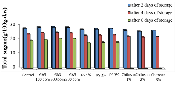 Total sugars: The effect of the various chemical treatments on the total sugars content in the fresh-cut artichoke during cold storage at 0°C is presented in Figure 5. The obtained results in the whole treatments revealed that there was a progressive decrease in this characteristic with extends of the storage periods. However, the application of gibberellic acid led to keep the highest total sugars content followed by potassium sorbate and finally chitosan. However, the most effective concentrations in this concern was 200 ppm gibberellic acid, 3% potassium sorbate and 1% chitosan during all the storage periods meanwhile the least effective concentrations were 100 ppm gibberellic acid, 1% potassium sorbate and 2% chitosan.
