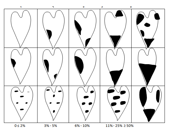 Figure 1 Yam leaf anthracnose disease assessment diagram + lesions on petiole and stem.