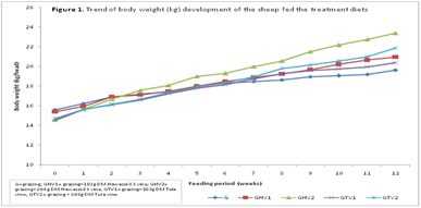 Trend of body weight (BW) development of sheep under the five feeding regimes is depicted in (Figure 1). Sheep under all treatments had fast weight gain during the first 2-3 weeks. GHV2 had almost continually gained BW throughout the experimental period, although the highest was between 4th and 6th week and had highest final BW followed by GTV2. During the early feeding period, GHV1 gained better than GTV1 but from 4th week to 9th week they were very close and then GTV1 regained more toward the end of the trial. With an added advantage of higher initial BW of the control (G), it has closely followed GHV1 till the middle of the study period but it was left behind later and had the lowest final BW. Sheep under GHV2 got pick weight gain between 4th and 6th weeks of feeding period. Because of the onset of the dry season the sheep under G and GTV1 experienced a minimizing trend in body weight gain from 6th week of feeding onwards, possibly due to depletion of natural pasture that did not match the increasing nutrient demand of the growing sheep.