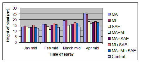 The data of interaction between time of sprays and type of fertilizers regarding height of plant and number of shoots and leaves per plant was illustrated (Figure 1-3). The results indicated differences among different values of the various parameters but with no significant difference.