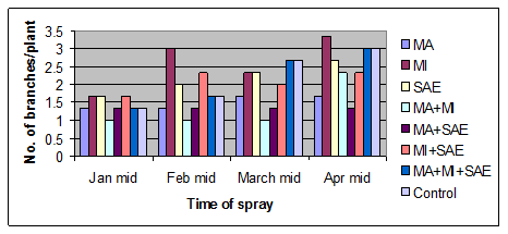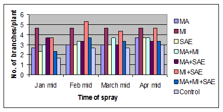 Number of shoots per rooted jojoba cutting did not differ significantly at all time of sprays regardless of the type of fertilizers used. The greatest number of shoots per plant (4.66) was observed with the spray of micronutrient fertilizers in comparison with other type of fertilizers whereas the least number of this character (2.50) was recorded with spray containing MA+MI+SAE.