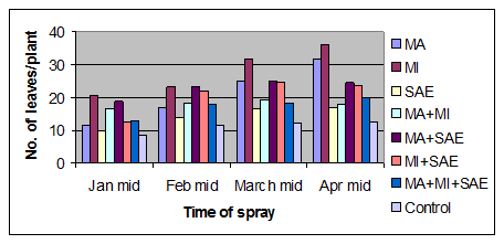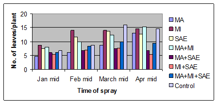 Regarding number of leaves per plant, it was similar to those mentioned in the first and second parameters in which the highest number of leaves per plant was seen after spray of fertilizers in the mid-March whereas the lowest number of leaves per plant was noticed after the first spray of fertilizers in the mid-Dec. irrespective of the time of spray of fertilizers. Significantly, the greatest number of leaves (27.75) was recorded by the spray with micronutrient fertilizers but the least number of leaves (11.25) was gained by the spray with treatment containing MA+MI+SAE. The ideal type of foliar spray fertilizer was the micronutrient fertilizer in majority of parameters studied, this might be due to bleaching of some nutritional elements from plant leaves either macro or micro elements. Therefore, the plant element’s requirement was higher from the micronutrient fertilizers over other type of fertilizers and this result appeared clearly almost in all parameters investigated. Regarding why the spray containing MA+MI+SAE yielded the lowest value almost in all parameters studied, this could be due to weakness uptake of elements by plant foliage when added at one time, perhaps some clashing was created among cations and anions of different elements either macro or micro elements.