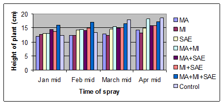 Rooted cuttings of jojoba plants were sprayed with different types of liquid fertilizers i.e., macronutrients (MA) (Bio 20; Omex, Agrifluids, Lmt., England), micronutrients (MI) (Omex; micromax, Agrifluids, Lmt., England), and sea algae extract (SAE) (Gaefol AL-Khair, Chema Industries, Egypt) (use to strengthen root system and increase nutrient uptake) individually and in combinations viz, MA+MI, MA+SAE, MI+SAE, MA+MI+SAE additional to the control (untreated plants), each combination had the same ratio in volume. Plants were kept under greenhouse conditions under temperature range less than 35 ͦC by using Pad Cooling System and the humidity range was not more than 60%. Both of them were measured with Hygro-Thermometer device (Jumbo Display Hygro-Thermometer, USA). Treatments were achieved in four periods, starting time was the mid-Dec then mid-Jan, mid-Feb and the mid-March with 30 day intervals during the years 2013 and 2014. Evaluation of obtained data of jojoba plants for different parameters such as height of plant and number of shoots and leaves per plant were calculated for four times, but starting time was from the mid-Jan. to the mid-Apr. Studying only of these three parameters is owing to that these characters give fast reading and perfect view regarding important aspect of plant i.e., growth of plant.
