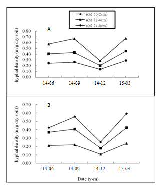 Soil samples in 0-2cm, 2-4cm and 4-8cm away from taproot of the host plant, were collected with punching bear on 15th in June, September, December in 2014 and March in 2015, respectively. The soil samples from six random pots were mixed and sub-sample was taken for determination of hyphal length, GRSP and HMs sequestered by GRSP.