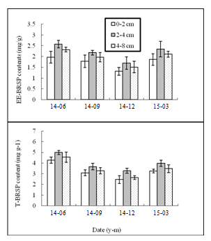 In additional, soil C and N pools affected BRSP significantly. Lovelock et al.,24 thought glomalin was a significant component of total soil C (3.2%) and N (5%) pools in the surface layer. The 0-2cm soil in horizon might contain less soil C pools due to the uptake by citrus, compared to 2-4cm and 4-8cm soil. Additionally, the EE-BRSP and T-BRSP might decompose too much because of the amounts of microorganisms in the 0-2cm soil.