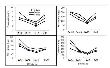 Figure 5 The amount of Fe, Cu, Mn and Zn bound to GRSP in the rhizosphere of Citrus reticulate. Data are expressed as means (n = 6)..