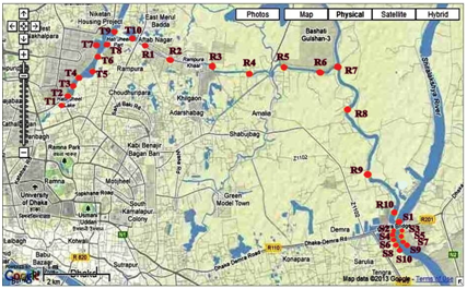 To complete the comprehensive study of the proposed research, the study area was selected from Tejgaon-Rampura canal to Shitalakhya River – a span of 30 km (Figure 1). The whole area was divided into three small parts viz., Tejgaon Khal (T), Rampura Khal-Balu River (R) and Shitalakhya River (S) closed to Balu River. Ten points from each part were selected and water, sediment, soil and plant samples were collected from each point. Water samples were collected by using 500 ml plastic bottles; pH and DO were tested instantly. Two sets of water samples were collected from each point: one set was used to determine BOD and COD and the other set was preserved with 2-3 drops of concentrated HCl in refrigerator for further analysis. The collected sediment samples were dried appropriately and then passed through a 0.5 mm sieve. The sieved samples were stored in plastic pots for chemical analysis. The soil samples were collected from the surface 0-15 cm depth, samples were air dried and visible roots and debris were removed and discarded and preserved as described by Imamul Huq and Alam.10
