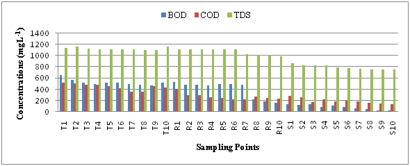 Different water quality parameters like pH, Dissolved oxygen (DO), Biological Oxygen Demand (BOD), Chemical Oxygen Demand (COD), Total Dissolved Solids (TDS), Ammonia-N, along with some heavy metals Zinc (Zn), Copper (Cu), Lead (Pb) and Cadmium (Cd) were analyzed and the results are given in the Table 1. Color and odor are important characteristics of water for physical characterization and it was observed from the study that the color of the water of Tejgaon Khal and Rampura Canal was black or dark black. The pH values of collected water sample ranges from 6.62 to 7.46, which is slightly acidic to slightly alkaline in nature and it increased with increasing distance towards the Tejgaon Khal to Shitalakhya River (Table 1). The pH of Shitalakhya River and Rampura Khal showed significant (at 5% level) difference with Tejgaon Khal. It might be due to higher amount of industrial effluent discharge in Tejgaon Khal.