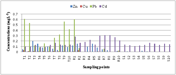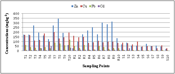 The concentrations of Zn, Cu, Pb and Cd ranges from 62 to 508 mg kg-1 for Zn, 20 to 131 mg kg-1 for Cu, 13 to 52 mg kg-1 for Pb and 0.04 to 1.40 mg kg-1 for Cd, respectively (Table 3). The maximum permissible limit of Zn, Cu, Pb and Cd in soil is 64 mg kg-1, 26 mg kg-1, 32 mg kg-1 and <1 mg kg-1, respectively.10 The results showed that soil samples from Tejgaon Khal contain higher concentration of Zn, Cu, Pb and Cd which are several times higher than the permissible limit. The concentrations of metals in soils are found to decrease with distance away from the disposal point Tejgaon (Figure 4). The concentrations of Zn, Cu, Pb and Cd in soils from Shitalakhya River are found below the standard limit. This implies that the soils from Tejgaon Khal and Rampura Khal is contaminated with heavy metals which may comes to the food chain and may cause toxic effect to human health. The concentration of Zn in soil samples from associated area of Shitalakhya river are varies significantly (at 1% level) with the soils of Tejgaon Khal and insignificantly with the soils of Rampura Khal. Cu, Pb and Cd concentrations in soils from Shitalakhya river area significantly different (at 1% level) with the soils of Tejgaon Khal and Rampura Khal area. Soils from Rampura Khal are also significantly differing for Cu (at 1% level), Zn, Cd (at 5% level) and insignificant difference for Pb with the soils of Tejgaon Khal area. Total Cd, Pb, Zn and Cu contents of surface soil in waste water irrigated locations are above the normal ranges of these metals for soils.2,16