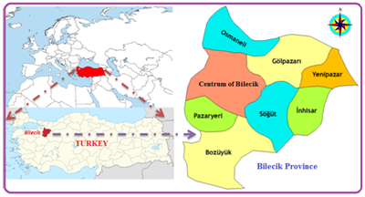 Bilecik is situated in the Marmara region of Turkey between 39º 39 'and 40º 31' north latitudes and 29º 43 'and 30º 40' east longitudes. It is the only province that is adjacent to four geographical regions of Turkey. For this reason, it is a transition zone in terms of climate characteristics. Bolu and Eskişehir in the east of the province, Kütahya in the south, Bursa in the west and Sakarya in the north. The area of Bilecik is 4,307 km2. Geographically, the height of the sea is 500 m. of Bilecik; The Gölpazarı, Osmaneli and Söğüt districts are located on the Sakarya River shore, with micro climate climate zones. The location of the Bilecik province on the Turkey map is given in Figure 1. In the study, Spot 5 satellite images were used for the images used in land classification. These satellite views were taken special for this work on May 20 and May 24, 2014. In addition, in order to reveal the temporal change of land use in the study, archives of Spot-5 satellite images of 2010, 2011, 2012, 2013 were used as material in the images.