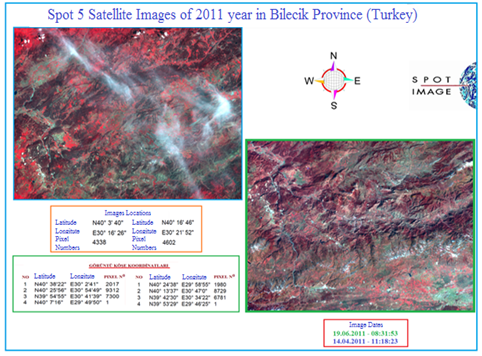 SPOT 5 satellite images to be used in the research have frame width of 60 x 60 km and terrestrial sampling resolution of 2.5m. The new satellite image for May 2014 was provided by the Ministry of Food, Agriculture and Livestock. Shooting trajectories and dates for the satellites taken in Table 1. Table 2 shows the technical specifications of the SPOT 5 satellites and the position of the satellite satellites taken was given in Figure 2. In addition, examples of raw data of SPOT 5 satellite images taken by the Ministry of Food, Agriculture and Livestock in Bilecik province in 2011 are presented in Fig.