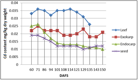The dynamics of Cd accumulation in almond leaves and fruits: It is known that the Cd concentration in annual plant varieties is much higher than in fruit trees, proof of which is the almond tree. Generally speaking, during growth and development, the Cd concentration in leaves and hull decreased, while this decrease was more pronounced in the shell (from 0.025 ± 0.0015 to 0.011 ± 0.0006 mg kg-1d. wt.) and the kernels (from 0.18 ± 0.0014 to 0.010 ± 0.0004 mg kg-1d. wt.). It can also be seen in Figures 1 & 2 that the Cd concentration in leaves is twice as high compared to various fruit parts, specially the kernels (55-60%) close to the end of vegetation, pointing to the conclusion that Cd transport from leaves and/or xylem to the kernels is very slow. Average Cd concentrations in the studied period ranged in the leaves from 0.0333 - 0.0334 mg kg-1d. wt., in the hull from 0.0183- 0.0209 mg kg-1d. wt., in the shell from 0.0155-0.0163 mg kg-1d. wt. and in the kernels from 0.0136-0.0151 mg kg-1d. wt. A higher initial Cd concentration may be linked with a more pronounced trophic activity of the almond trees at the beginning of vegetation and/or with the levels of certain elements ( Iron for ex.) in that particular phenol phase.