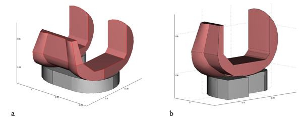 Analysis described in this paper can be divided into two parts. The first part contains models with both materials and geometry used currently in Mexican Hospitals, and whose results are shown in Figures 4A & 4B. In these models was shown that contact stresses on the UHMWPE surface were higher than yield strength (20–25MPa), and much higher than permissible stress. Although a modification was introduced on the external geometry in the latter model, modification that helped to decrease contact stresses on surfaces of both prosthesis components, it was not enough to reach an acceptable range. In fact, results of the Finite Element Analysis demonstrated that surface bears the whole load between both bodies. In the second part of the analysis two models were solved by finite element using UHMWPE in both the femoral and tibial components, as shown in Figures 4C & 4D. Both models have identical external geometry, but the second one has misffiting inclusion in the internal architecture in the femoral component of the knee prosthesis. In fact, changes were made only in femoral component in order to demonstrate the influence of its mechanical properties on the stress distribution of the tibial insert surface.