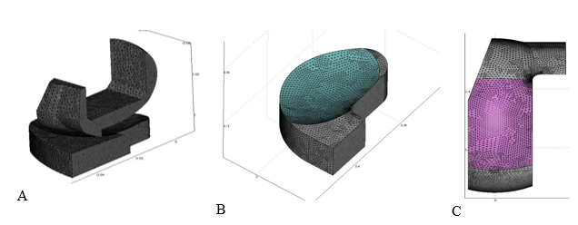 Figure 2 Meshing of the TKR model: A) Half model, B) Tibial component contact surface and C) Femoral component contact surface.