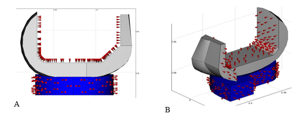 Figure 3 Loads, constraints and boundary conditions for A) longitudinal cross section and B) isometric FEM model.