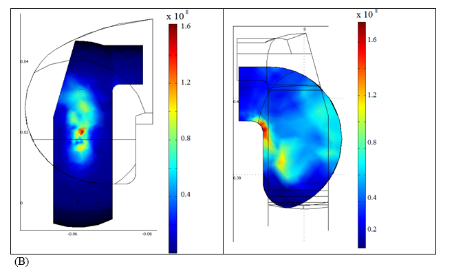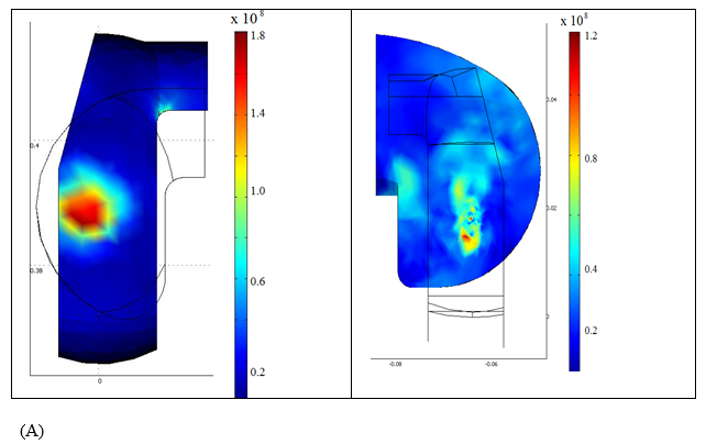 Figure 4 shows the Von Misses stresses for the TKR commercial model. In this figure are shown the maximum contact stresses experienced in one of the nodes of the mesh arrangement. These are in the case of the femoral component: 180, 162, 120 and 34MPa; and for the tibial component: 121, 174, 36 and 25MPa. Considering now the pair Vitalium-UHMWPE as shown in figure 4A, it may be seen that the stresses around 70 to 121 on the tibial component are concentrated in small areas, which will indeed over a period of time will be nucleation centers for wear and fracture. However the larger area experienced stresses between 40 and 60MPa, which are within the limits of the yielding stress of the UHMWPE. In the second model depicted on figure 4B the geometry of the tibial insert was slightly modified to obtain an improved conformal contact and increase of the contact surface. As a result of these changes, contact surface increased by 5 percent and contact stresses in the femoral component decreased by 10 percent. However, results for this model exhibited higher stresses on UHMWPE tibial component, from 174 to 110 around the change of curvature of the tibial component which will cause its failure. In contrast with regards to the UHMWPE - UHMWPE prosthesis shown in Figure 4C & 4D, the contact stresses are considerably smaller than those of the metallic femoral component. The largest stress is found in the femoral component with a numerical value around the 80MPa. For the tibial component the stresses are close to the 35MPa. The maximum stresses distribution is similar to the Vitalium- UHMWPE prosthesis because both are considered completely solid. Finally the model shown in Figure 4D where misffiting inclusions were introduced, the maximum contact stresses found were of the order of 15Mpa. This is attributed to the effect of the inclusion.19–23