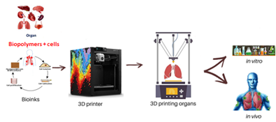 Montaser declared in November 20208 that tissue engineering techniques enable the manufacture of tissue substitutes that integrate biological cells, materials and bioactive compounds to replace or repair damaged or diseased tissue. Despite early success, the current technology is unable to manufacture replicable tissue formulations with structural and functional similarity to the original tissue. The recent development of 3D printing technology offers opportunities for the development of functional complex tissue alternatives through the manufacture of layer by layer of cell(s), bioactive material(s) and compound (s) bioactive with precision and a three-dimensional concept on site. In vitro bioprinting is to cut the intermediate part of developing cells in the laboratory and transplant cells directly into the body for growth. Mesenchymal stem cells (MSCs) have been reported as promising treatments for lung disease. 3D bioprinting assumes human MSCs with bioink hypothesis as a potential treatment for lung damage. Human lungs do not have the ability to regenerate. Building an artificial lung to replace the sick lung is the only alternative to treating patients with acute lung disease. 3D printing helped manufacture the lung tissue isotope. Therefore, clinical advances in the use of bioprinted 3D cancer stem cells as cellular therapy for acute respiratory distress syndrome may have clinical effects during the COVID-19 pandemic. The development of 3D printed biological tissue to replace organs hopes to provide a new solution for patients in the queue. 3D bioprinting is one technique that allows the preparation of alternatives specifically designed for tissues. Rapid prototypes create possibilities for generating complex organs such as kidneys, liver, lung or even heart, although there is a heterogeneous cellular composition. 3D bioprinting approaches can be used to create a model for lung disease and lung tissue. The current development of the manufacture of tissue engineered formulations using 3D bioprinting technology is essential for potential biomedical applications such as tissue replacement therapy, personalized therapy, and laboratory 3D modeling for drug detection(Figure 2).
