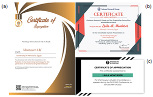 Figure 2 Some Certificates of Appreciation awarded to Prof. Laila M. Montaser for her keynote speeches on application of 3D bioprinting technology presented in the era of COVID-19: (a) Keynote speech awarded a Certificate of Recognition: Robotic in situ 3D bioprinting technology for the generation of functional engineered tissues. Int. Webinar on 3D printing & additive manufacturing, 2022, Aug 22-23, Singapore city, Singapore. (b) Keynote speech awarded a Certificate of Recognition: In Situ 3D Bioprinting for Tissue Engineering. Int. Webinar on 3D printing & additive manufacturing, 2022, April 13-14. (c) Invited speech awarded a Certificate of Appreciation*: Modern technologies/Where are we leaving? Global TIPE 3D printing conference 2022, Jan 18-20, New York, USA.