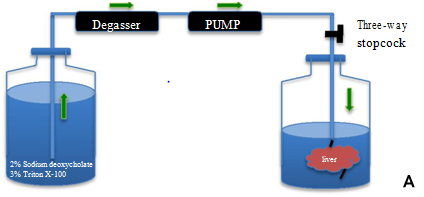 Freshly harvested rat livers were transported from animal room to the laboratory. The cannulated liver portal vein was connected to a peristaltic pump and connected to a degasser (DEGASi, Sweden) via silicon tubing (Figure 1A). All detergents for decellularization were prepared and kept overnight to get rid of air bubbles. The detergents were first passed through the degasser and then through the peristaltic pump into the portal vein of the liver. After thorough rinsing with heparinized PBS, 2% sodium deoxycholate (Sigma, USA) in distilled water was perfused at approximately 2 ml/min for 4 hrs. The scaffold was washed with distilled water (D/W) to remove residual detergent and then perfused with 3% TritonX-100 (Alfa Aesar, Germany) for 4 hrs. The process of decellularization continued until the liver showed an entirely white appearance. Lastly the decellularized liver (DL) was washed continuously for 72 hrs with D/W containing 0.02% sodium azide (Sigma, USA) and 5mM EDTA. The liver was sterilized with 0.1% peracetic acid for 1 hr and once again washed once with 500 ml of sterile PBS. A biopsy was snap frozen in liquid nitrogen and stored at -80˚C and used at a later time point for DNA, collagen, elastin, glycosaminoglycans (GAGs) and cytokines quantification. Another biopsy piece was fixed in 4% formaldehyde (Histolab, Sweden) for immunohistochemistry staining.