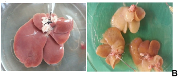 Whole rat liver decellularization was achieved by perfusion of 2% SDC and 3% Triton-X100 and was successfully completed in one cycle of 8 hrs. Although the portal vein was cannulated successfully, at the end of the decellularization process we found that the vein was slender and very fragile. The normal rat livers were pinkish in colour (Figure 1B), and after DC the rat livers became white and translucent (Figure 1C). The vascular network was visualized using Allura Red dye which initially showed that the capillary network was preserved (Figure 1D). However, in many DL the red dye was found diffused through the entire liver bed.